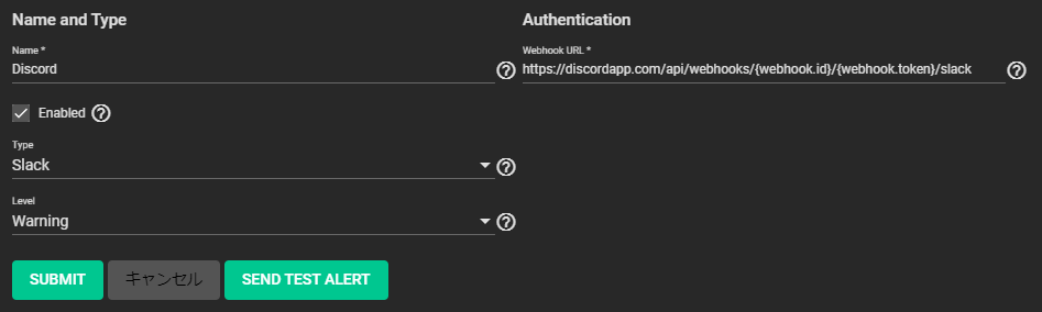 Nameに任意の名前、TypeをSlackに設定 - DiscordのWebhookのSlack互換機能を使う で作ったWebhook URLを入力