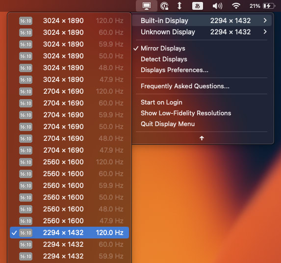 - DisplayMenu 等を開いて内蔵ディスプレイの解像度を調整する