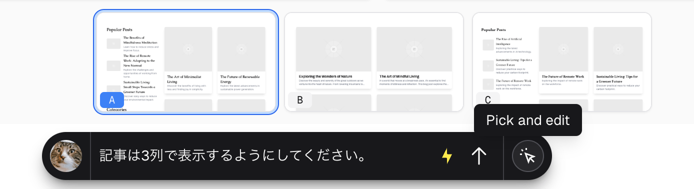 3つの中から一番良いものを選択し、修正内容を入力し↑を押して送信してください。