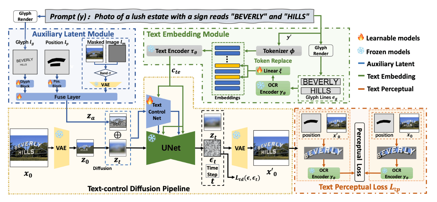 この図はAnyTextの仕組みです。この研究とStable Diffusion 1.5の繋ぎこみは図中のText Control Netによって行われているようです。
