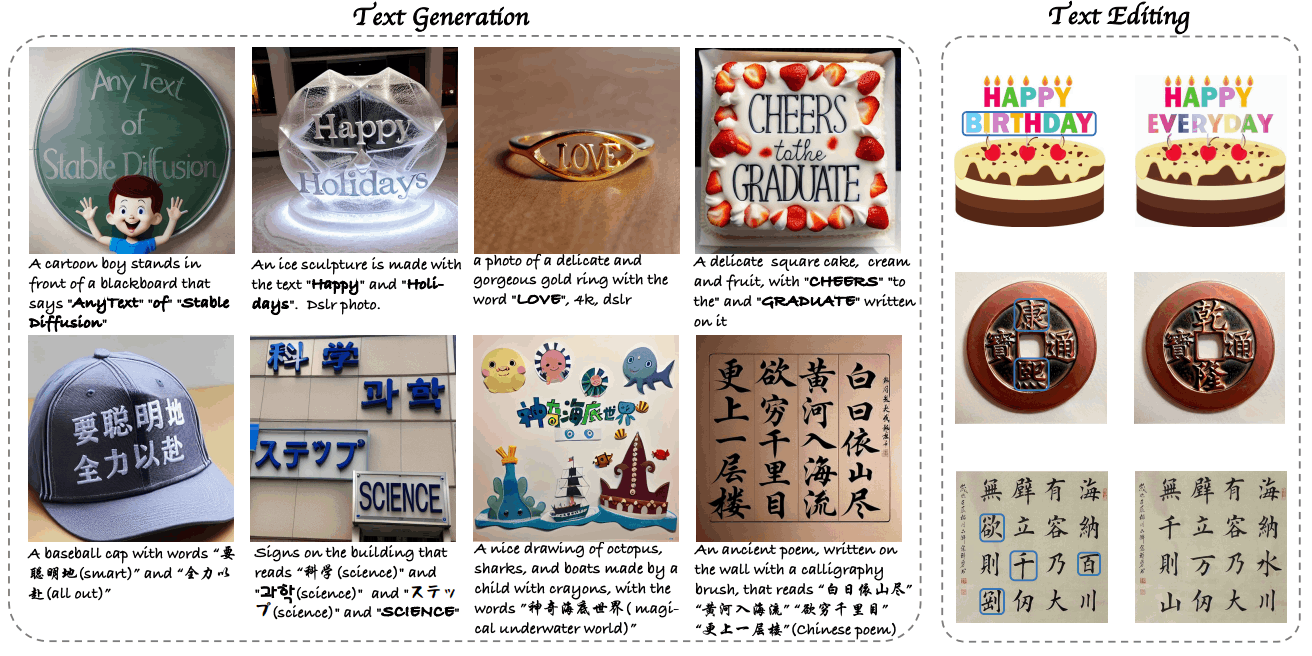 Alibabaグループによって開発された、文字も生成できる画像生成モデルです。Stable Diffusion 1.5をベースに作られていて、プロンプトで指示をすれば英語、中国語、韓国語、日本語で文字を生成できるのが特徴です。下のような画像たちが生成できるそうです。