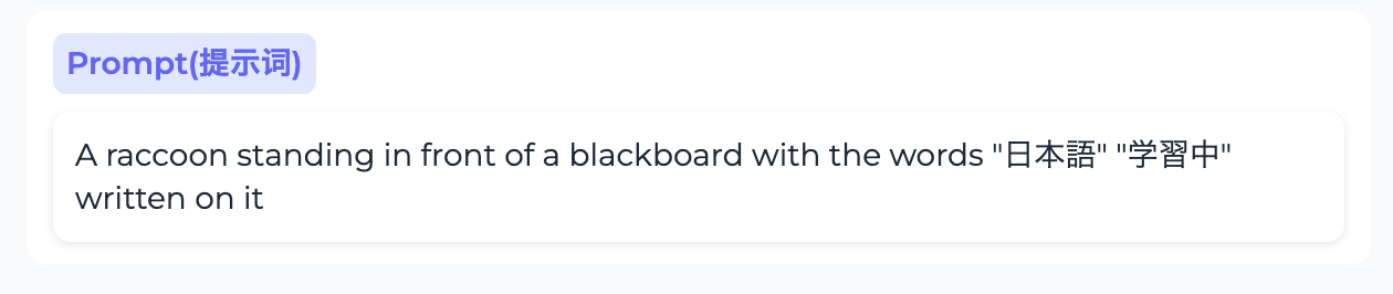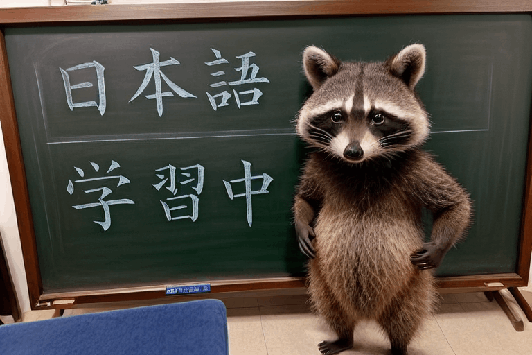 今回は「日本語学習中」と書かれた黒板の前に立つアライグマを生成してみます