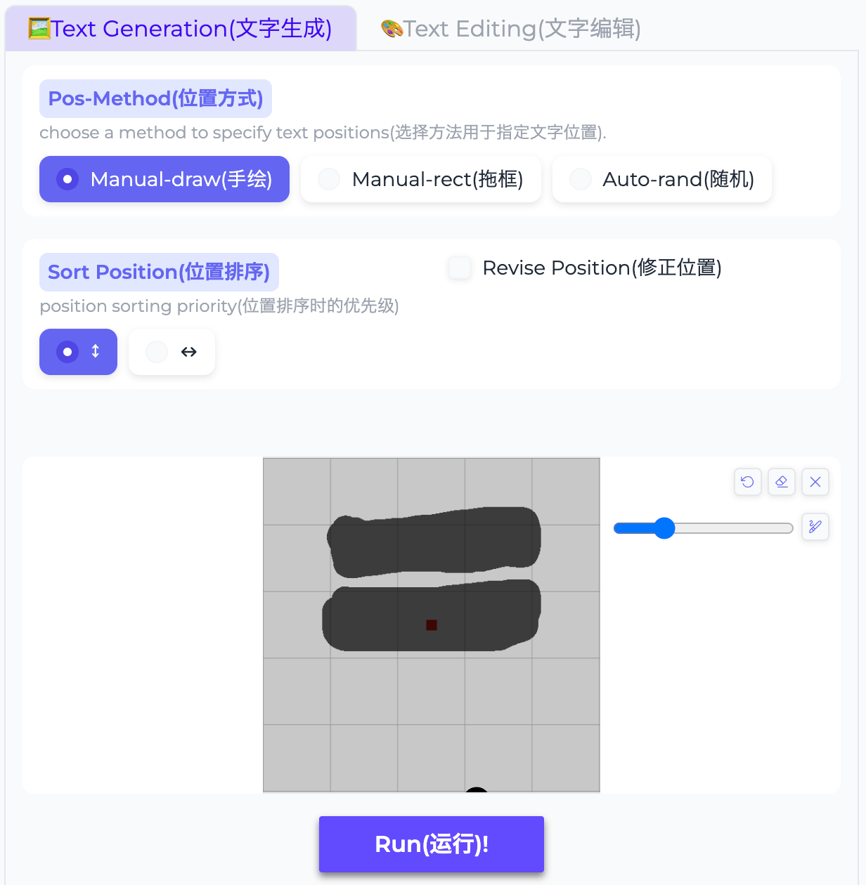 文字が描画されて欲しいところを塗って「Run」を押すと画像生成が始まります。