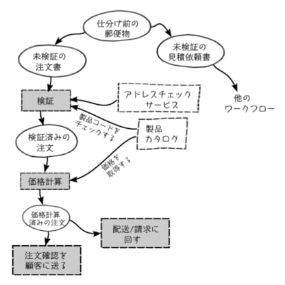図を見てわかるように 、処理を適用することで注文を異なる状態に遷移させ、それを次の処理の入力とすることでワークフローを構築しています。