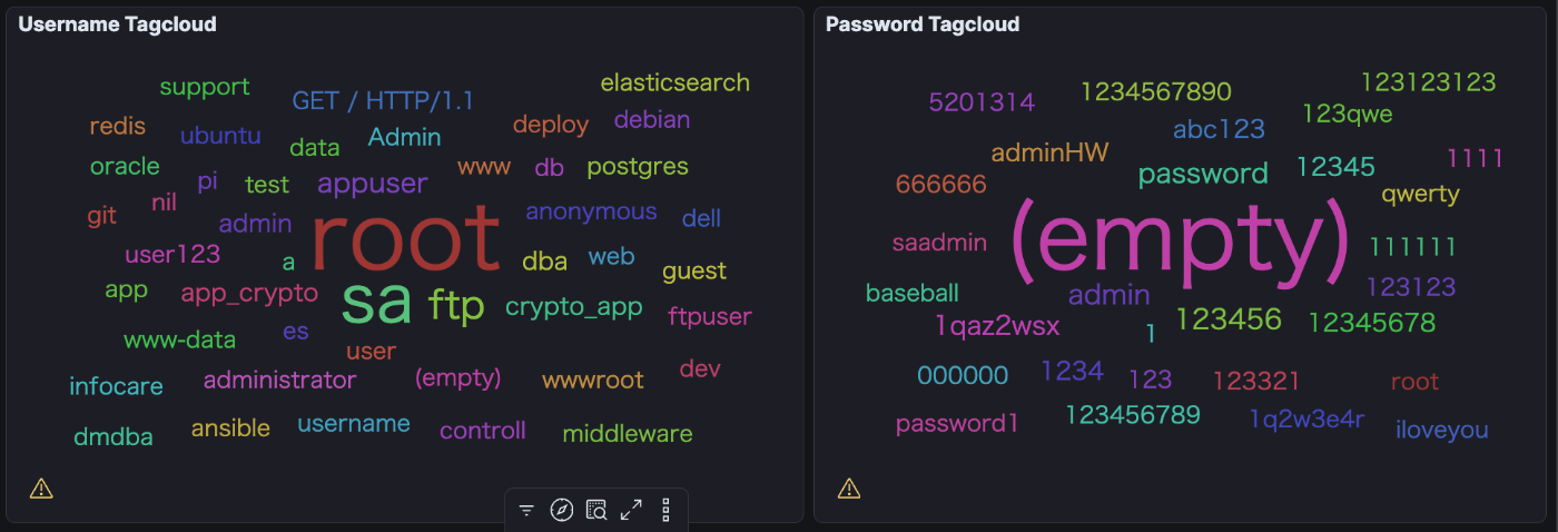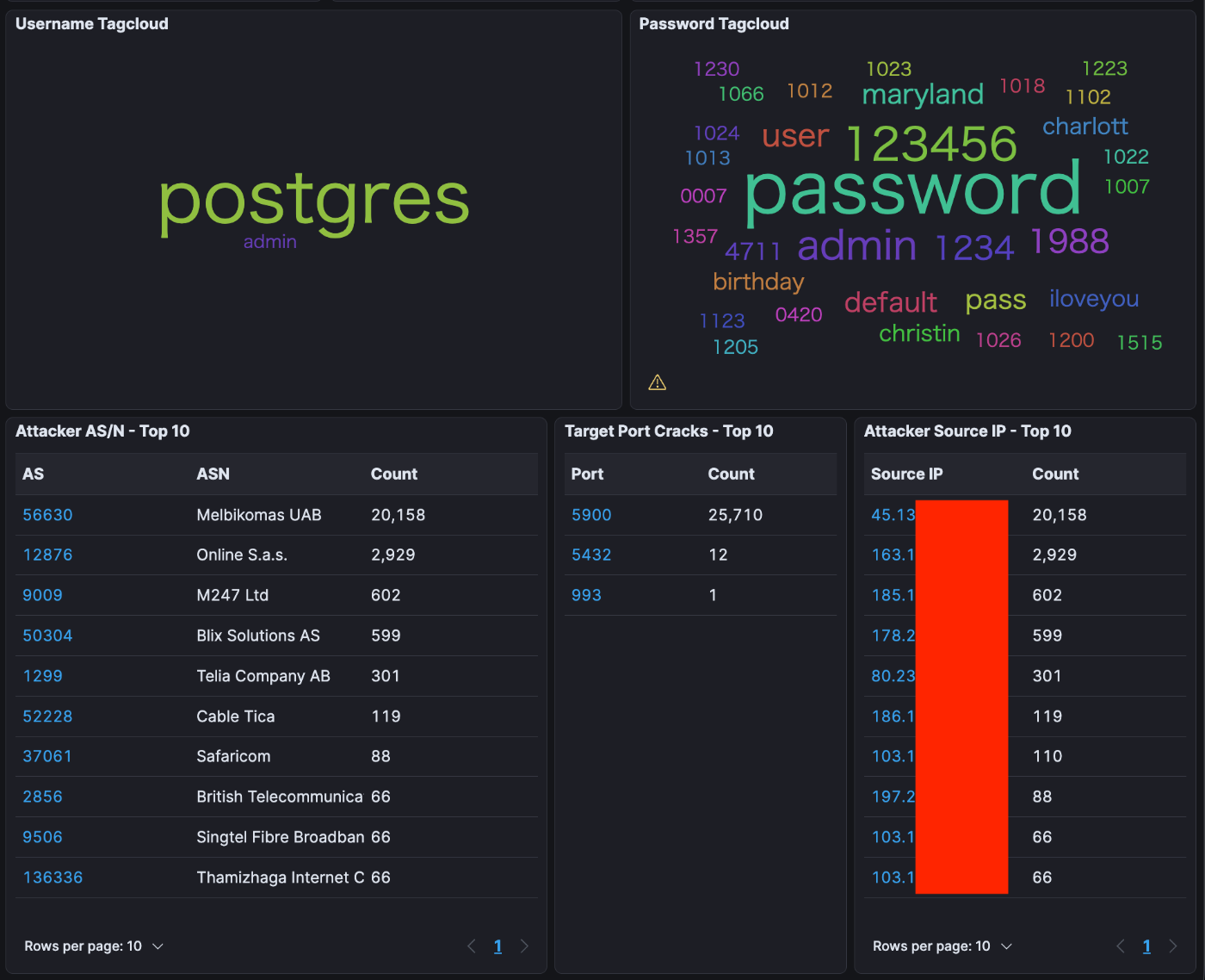 特定の1つのIPからの攻撃が多いことがわかります. 試行されたユーザネームはpostgresとadminのみで, パスワードは4桁の数字の総当たりと辞書攻撃と見られます.