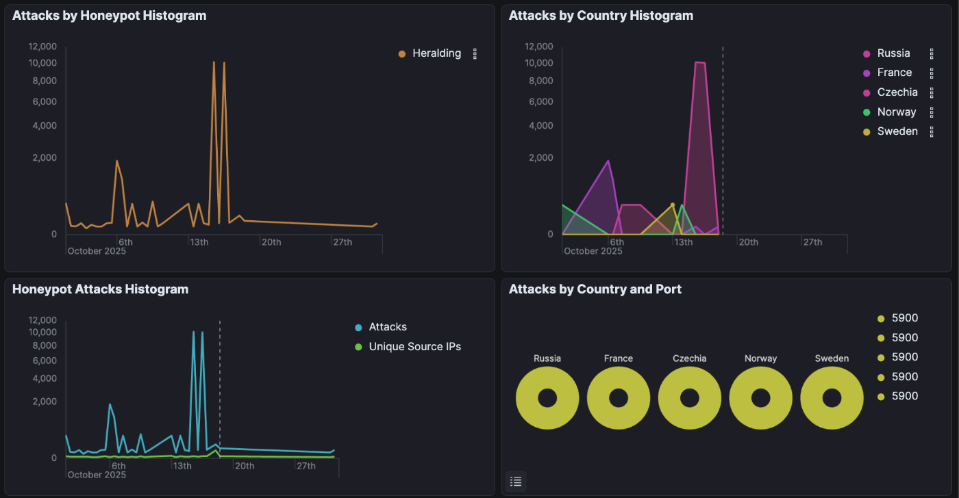 Heraldingは, ftpやtelnet, ssh, httpに関する認証情報を収集するポットです. 10/15-17にかけて大幅に攻撃が増加していることがわかります. 多くの攻撃は5900番ポートに対する攻撃で, 既知の攻撃者であるとわかります.