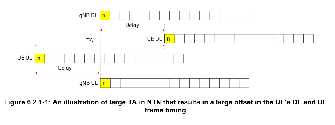TAはUEとgNB間の伝搬遅延の2倍とし、gNBにおいてgNB ULとgNB DLのフレームタイミングが一致するようにTAを設定するのが原則でした。NTNでは大きな伝搬遅延のためUEは非常に大きなTA値を適用することになります。この関係はTR 38.821図6.2.1-1の下図のように示されます。UEが大きなTAを適用し、gNBのDL フレームとULフレームのタイミングが揃うシナリオを示しています。