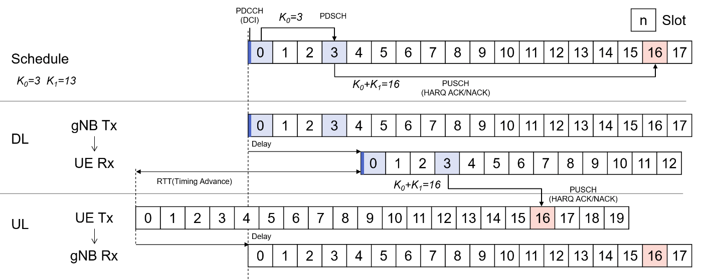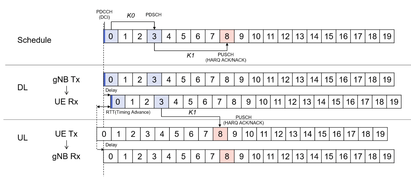 PDCCH/DCIでスケジューリング情報が格納されています。UEはDCIを受け取ってから、(DLの場合)PDSCHを受信してPUCCHでHARQ ACK/NACKを送ったり、(ULの場合)PUSCHを送ります。その際に、DCIを受信してからUE内で待ち受けたりデータ処理をするために僅かな時間(数ms程度)が必要になりますので、数スロット分のオフセットが設定されます。このオフセットには以下の3つがあります。