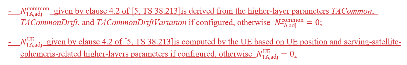 N_TAとN_TA,offsetは従来からある項で、TS 38.213 4.2節で説明されています。TAの別記事でも解説しているように、N_TAは地上のセルを想定した項のためNTNで使うには値が小さすぎます。続く、N_common_TA,adjとN_UE_TA,adjの2つの項がNTNが標準化されたリリース17で追加されています。