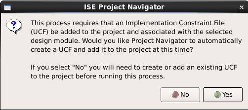 View:を"Implementation"にし,Processes:のUser Constraints>I/O Pin Planning(Planahead) - Pre-Synthesisを押と以下のような画面が出てくるので"Yes"を押す.