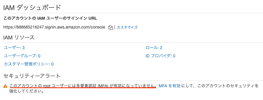 ルートユーザー(最初にクレジットカードを登録したユーザー)のMFAが有効になっていないと警告を受けますが、これはワンタイムパスワードが有効になっていないためです。