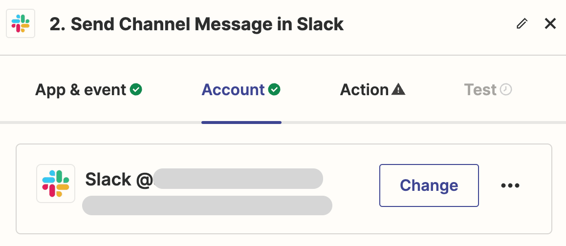 - Accountタブで「メッセージを送信するSlackアカウント」を接続