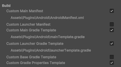 - Project Settings > Player > Publishing SettingsでCustom Launcher Grade TemplateをオンにしてAssets/Plugins/Android/launcherTemplate.gradleを生成
