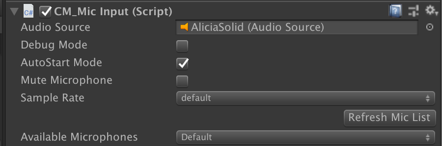 AudioSourceに自身を設定してください。また必要であればAvailable Microphonesから利用したいマイク入力を選択してください。