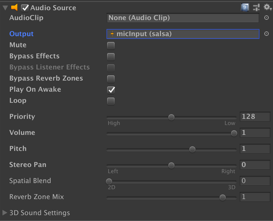 AudioSourceのOutPutにmicInputを設定してください。右側の○から探すと楽です。