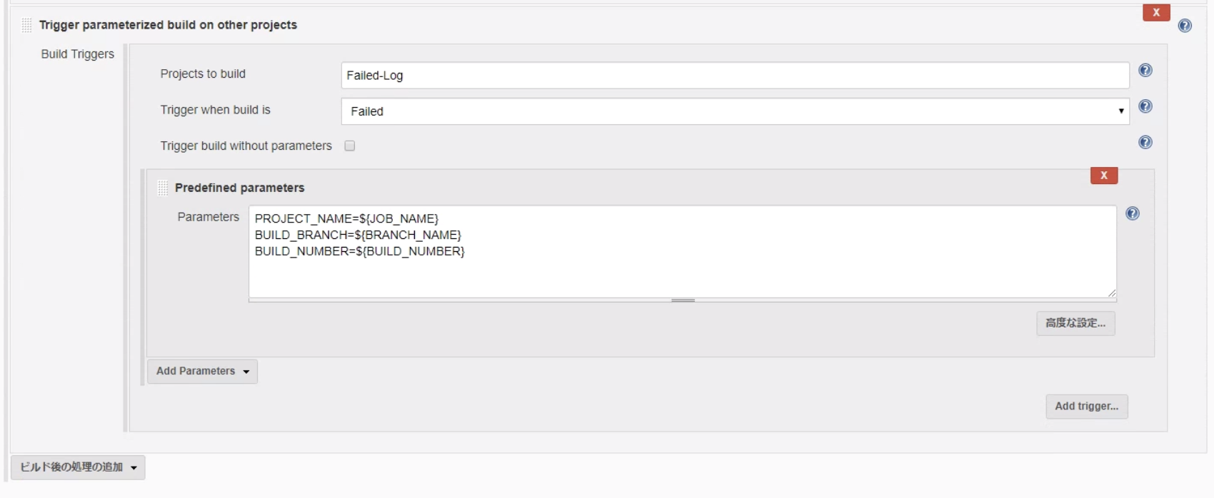 今回はParameterized Trigger pluginを使いました。これはパラメータを引継ぎつつ下流ジョブを動かすことができるプラグインです。ログを出力する際に必要がパラメーター渡しつつ、また発火の条件を指定することもできる(今回はビルド失敗時)ため、要件に合致していました。