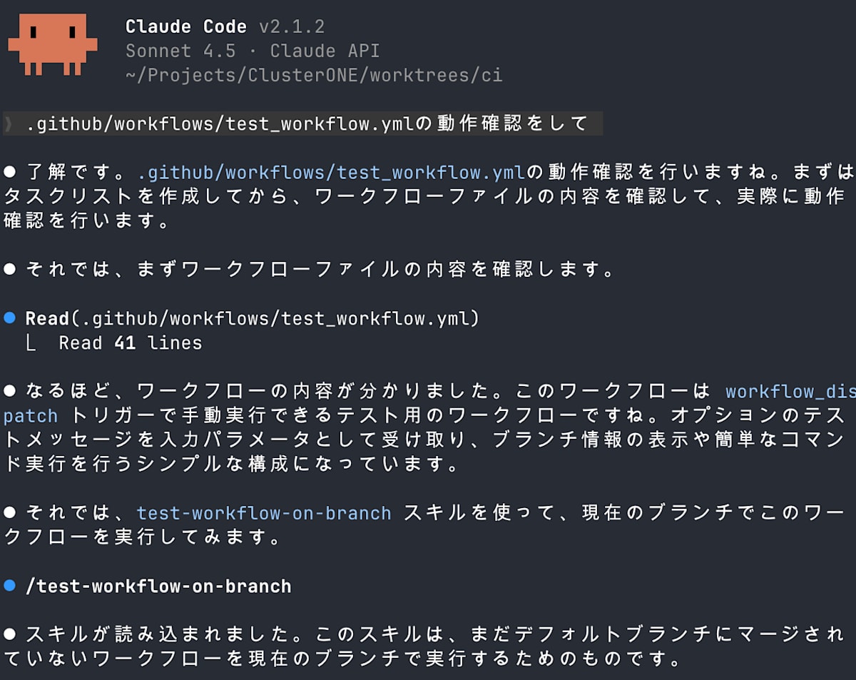 Claudeが会話の文脈から自動的に適切なSkillを選択して実行するほか、/test-workflow-on-branchのように明示的に呼び出すこともできます。