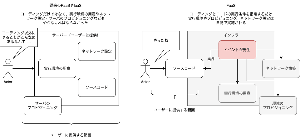 イベントが発生したらユーザのコードを実行する環境をデプロイされます。このため開発者は毎回、クリーンな実行環境を用意し直したり、サーバをプロビジョニングしたりする必要がありません。基盤としては、従来のようにユーザがサーバを占有しないため、純粋な開発においてはマシンリソースを大きく節約することができます。