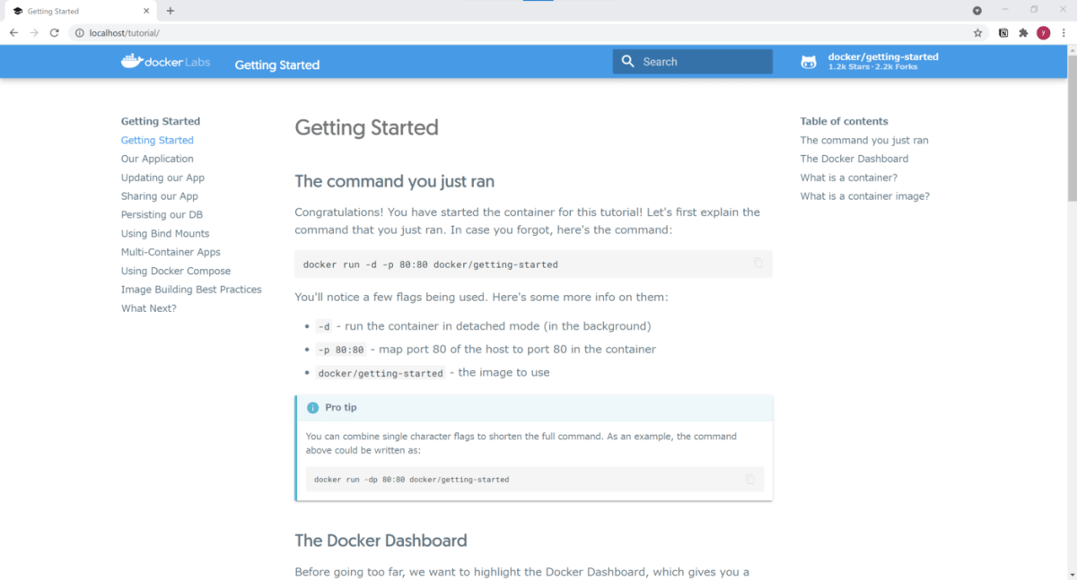 再起動後、Docker for Windowsが自動起動し、チュートリアルが立ち上がります。