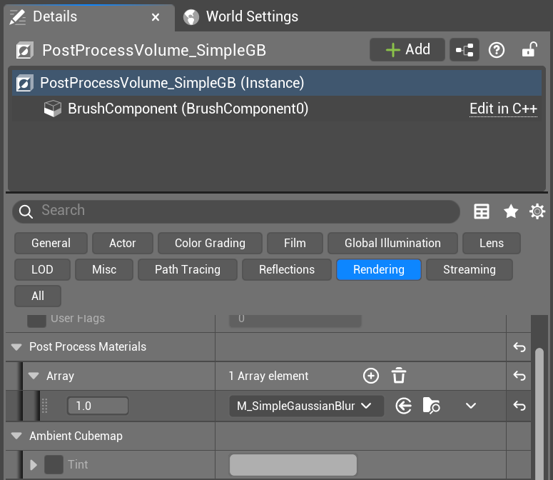 Post Process Volumeにポストプロセスマテリアルを一つずつ追加したら、二段階ポストプロセスで同じGaussian Blurエフェクトになります。