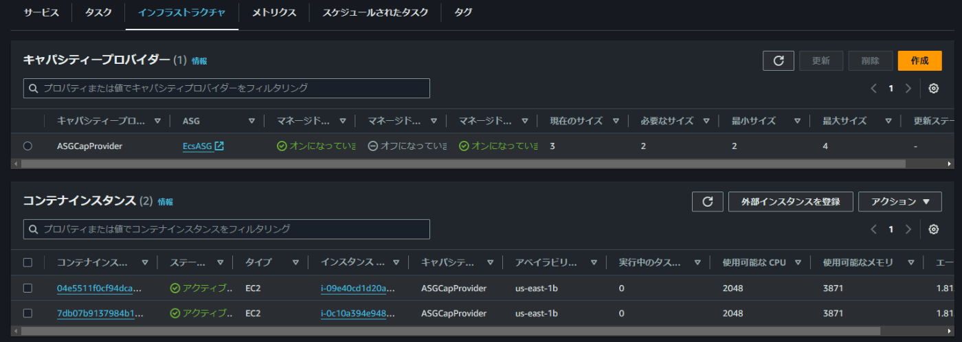 このテンプレートを使ってインスタンスを起動するために、Auto Scalingグループからインスタンスの更新を実行します。その際に起動テンプレートを先ほど更新したバージョンのものに置き換えてあげます。完了には十数分かかりますが、完了次第ECSクラスタインスタンスのコンソールを見てみると、登録されていることが確認できます。