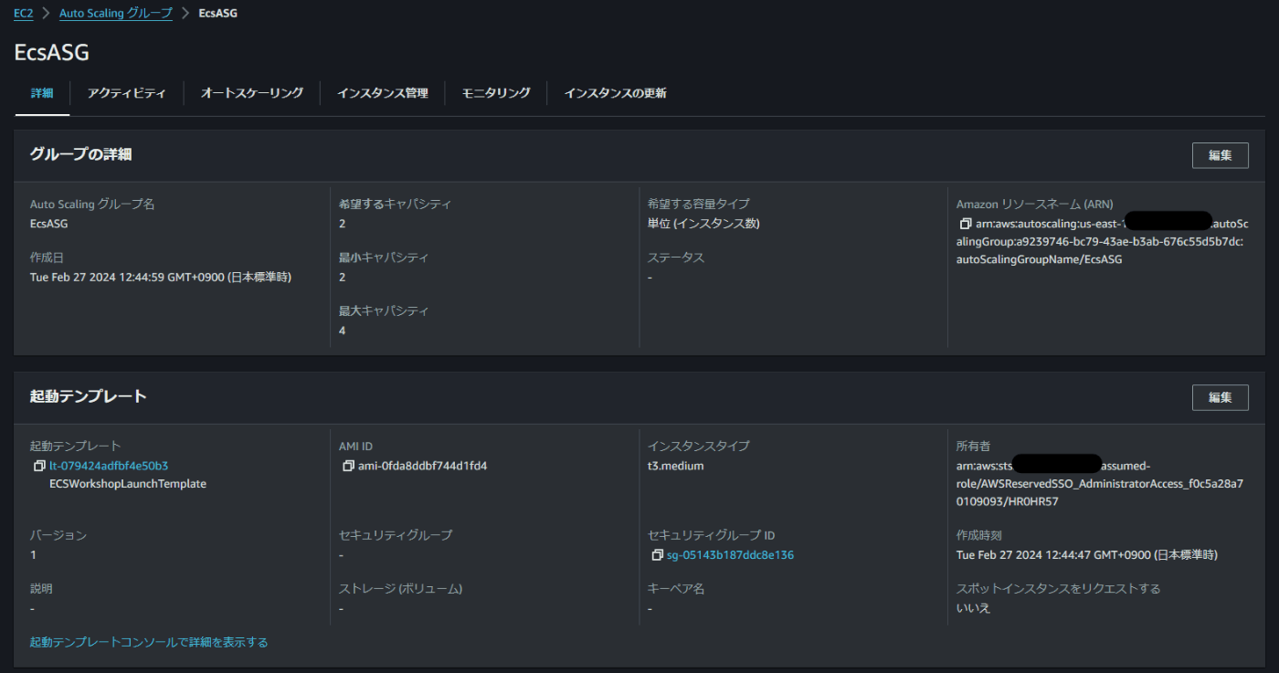 EC2コンソールから起動テンプレート(ECSWorkshopLaunchTemplate)を選択し、アクションから以下のテンプレートに更新します。