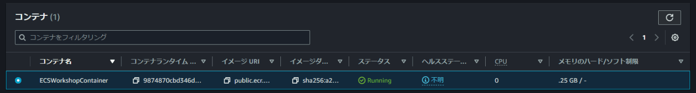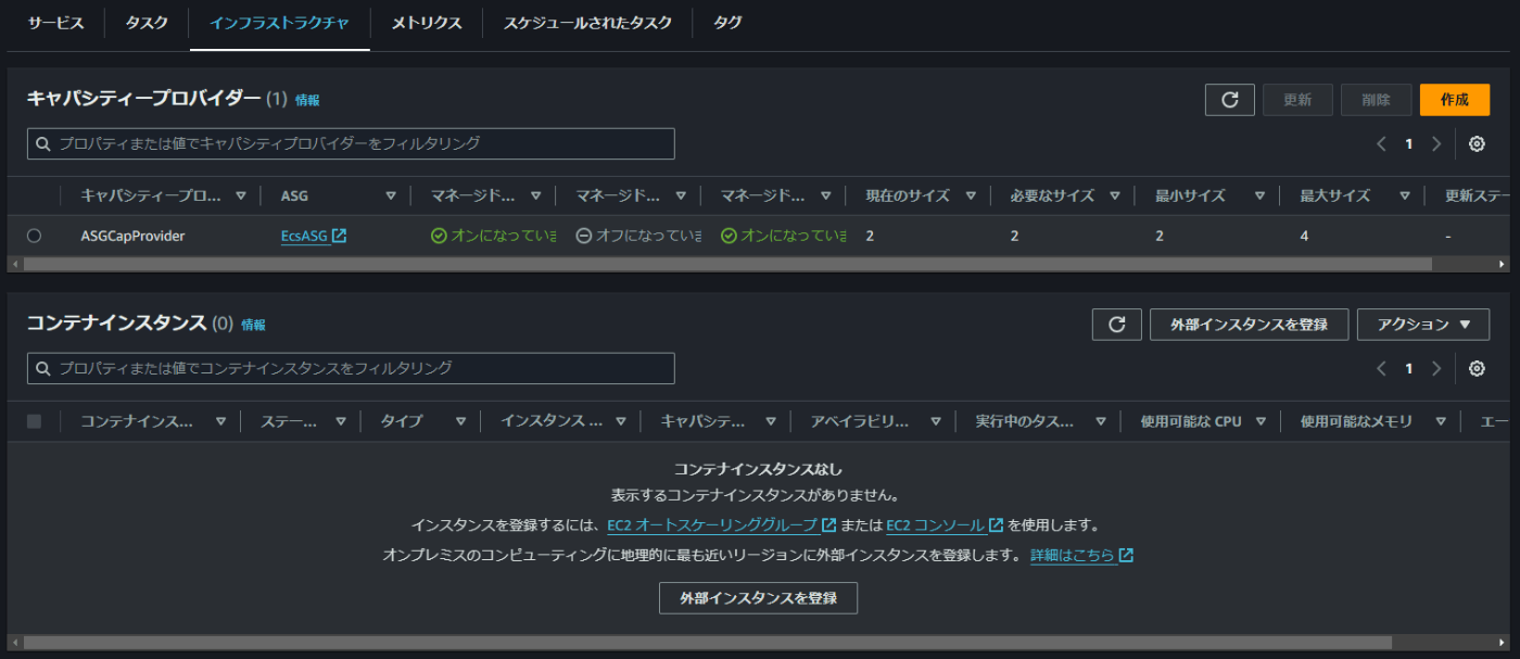 しかし、実際のコンテナインスタンスは登録されていないことがECSコンソール画面から確認できます。