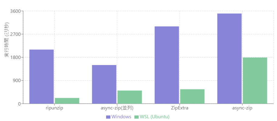 Windows を対象とするなら async-zip を並列化することも可能性としてはありです。ていうか、 Windows がなんでこんな遅いのか誰か教えてください。ファイルシステム?仮想ディスクの差?それとも Windows Defender ?マジわからん。