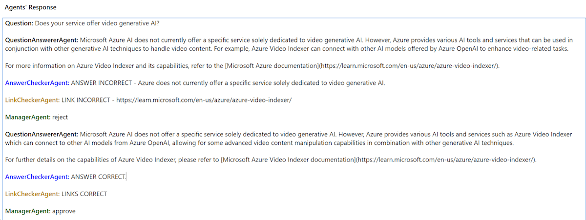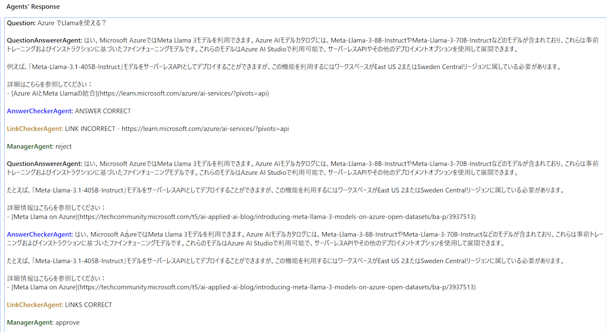 各エージェントの処理は、QuestionAnswererAgent、AnswerCheckerAgent、LinkCheckerAgent、ManagerAgentの順で呼び出されます。