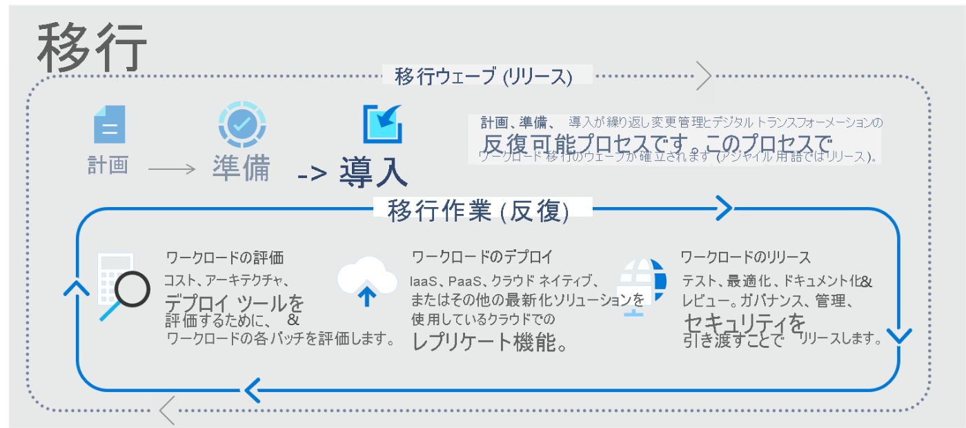 移行プロセスはMigration Service、Azure File Sync、Azure Migrateによって提供される機能によって行われる。
