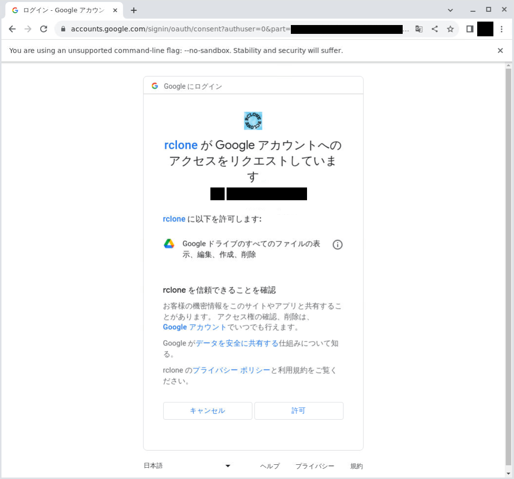 通常のrclone認証の通りにログイン要求されるので、ログインしてアプリを許可する。
