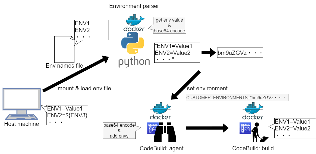 そこで別シェルで環境変数を読み込み、agentに環境変数値を渡すためにコンテナを用いて環境変数のペアをbase64でエンコードする。(シェル側で解析すればシェル内で完結させることも不可能ではないが、自前の解析処理を記述するよりもpythonの標準ライブラリを用いたほうが間違いもなく処理はシンプルにもなるためpythonコンテナ内で処理させている)