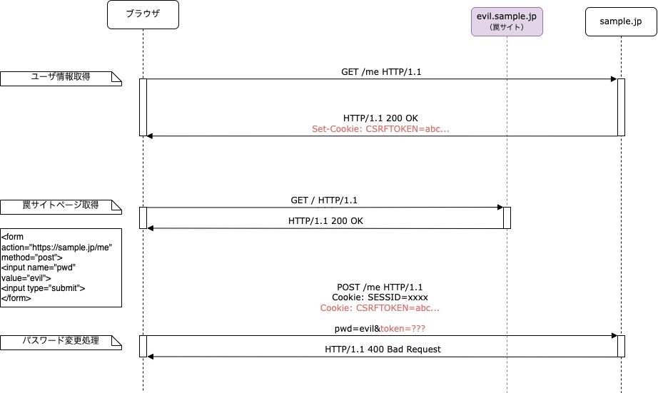 そのため、罠サイトからのリクエストではトークンが付与されず、攻撃は失敗します。