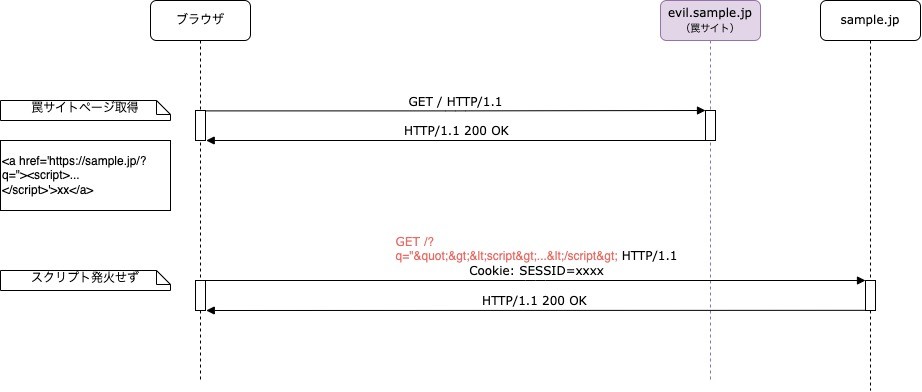 したがって、罠サイトからのリクエストでは Cookie に保存されたセッションIDが送信されず、攻撃は失敗します。