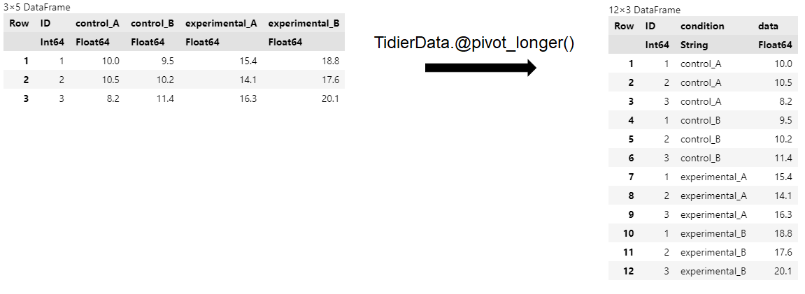 例えば以下のようなwideデータをTidierData.@pivot_longer()でlongデータに変形したとする。