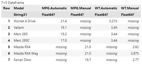 Rのtidyr::pivot_wider()には豊富な引数が用意されており、本来であればJulia移植後も以下のようなコードが実現されてほしい。この場合、Rであれば、wide展開後に作成される列はMPG.Automatic, MPG.Manual, WT.Automatic, WT.Manualの4列になる。が、2023/12/22時点では未実装なので、今後に期待。