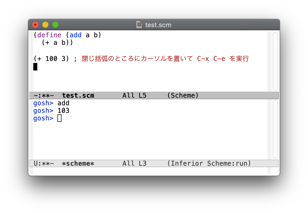 カーソルを式の末尾に移動させてから C-x C-e を実行すると、直前の式が評価されて scheme バッファに結果が出力されます。