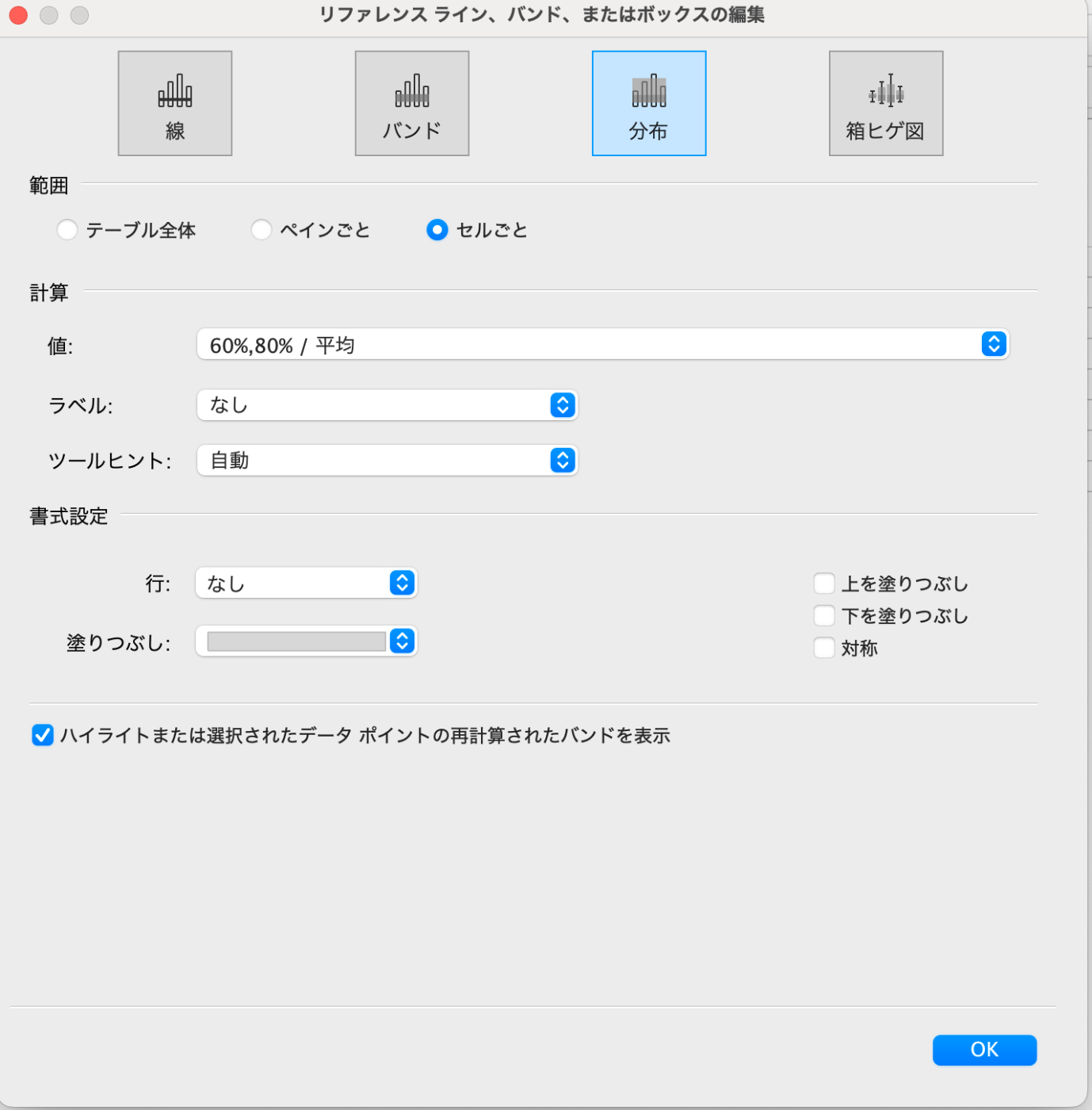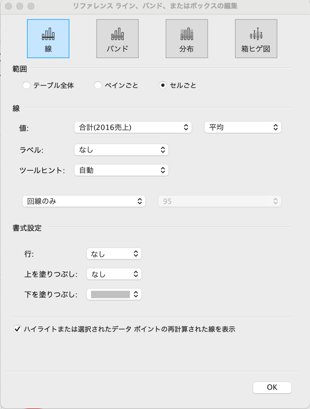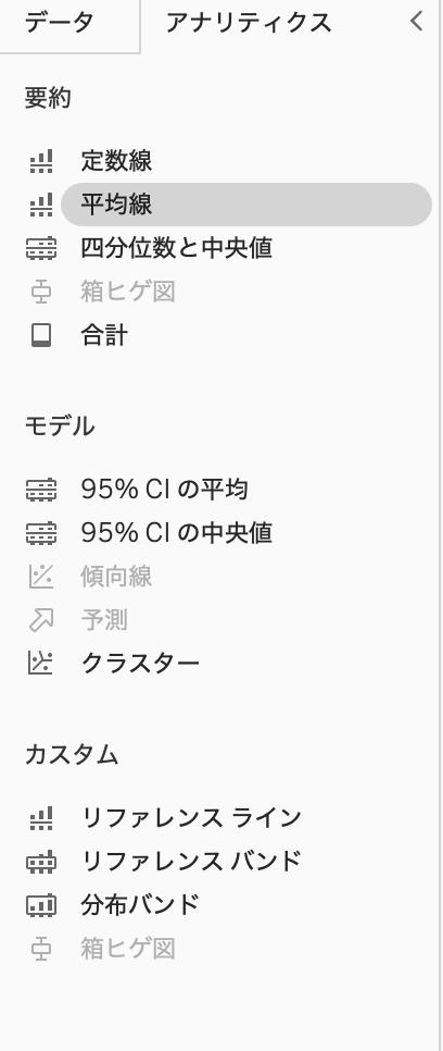 🍇アナリティクス2025/02/16に公開Tableautech・アナリティクスペイン 定数線や傾向線などを表示できる。 アナリティクス→定数線などをグラフにドラッグ&ドロップ ・標準偏差 グラフに平均線を表示する。 平均線を選択し、編集。 【分布】-【計算】-【標準偏差】を選択し、σの係数を入力。 ・リファレンスラインを棒グラフにする リファレンスラインをセルごとにドラック&ドロップする。 その後、【下を塗りつぶし】の色を選択する。 ・分布バンド 分布バンドは下図のような灰色の部分のところです。 割合ごとに色を塗ります。 【アナリティクス】-【分布バンド】を選択し、【計算】-【値】に表示したい割合を入力する。 Discussion