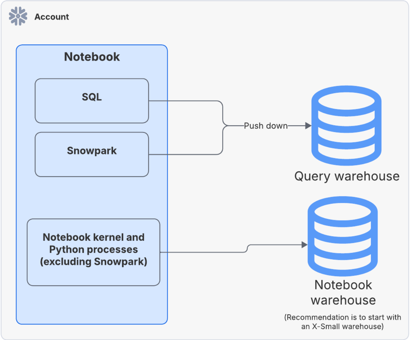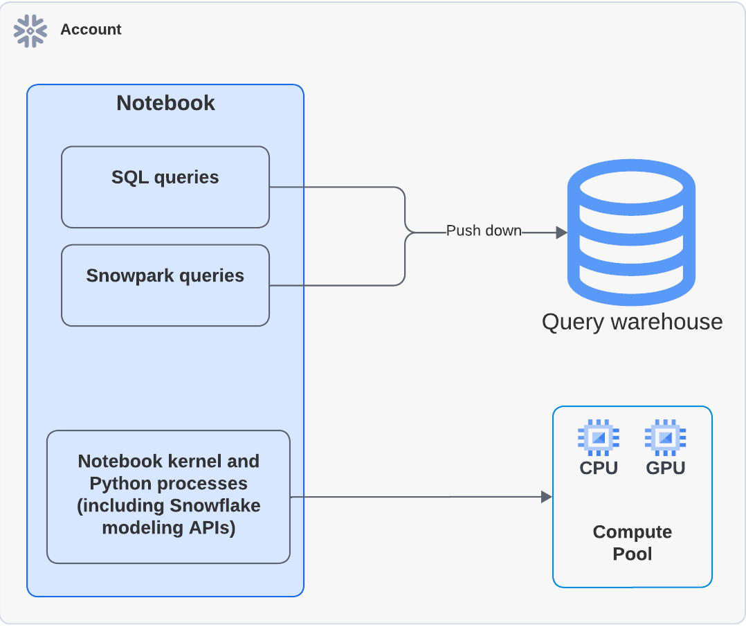 SQLセルやSnowparkプッシュダウンクエリは、ウェアハウスランタイムと同様にクエリウェアハウスで処理されます。