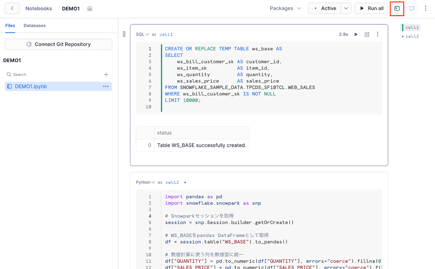 また、本筋からは少し逸れますが、Notebook上でSQLによる前処理からPythonによるデータ加工処理までを切り替えることなく一連の処理として記述できる点も印象的でした。都度、SQLやPythonでシートを切り替える必要がなく、1つのNotebookの中で完結できるのは非常に便利だと感じます。