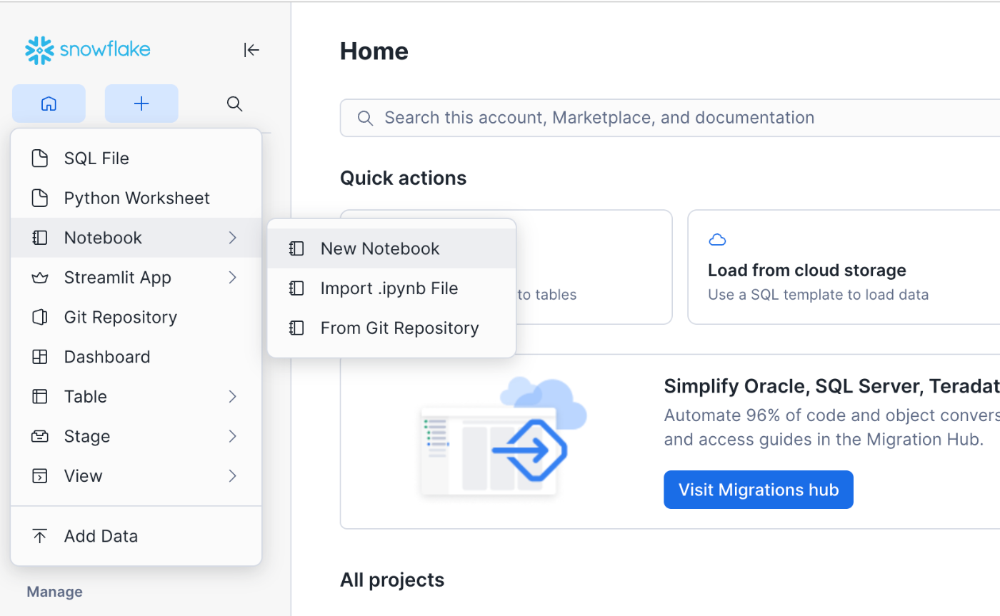 まずはSnowsightから新規のNotebookを作成します。