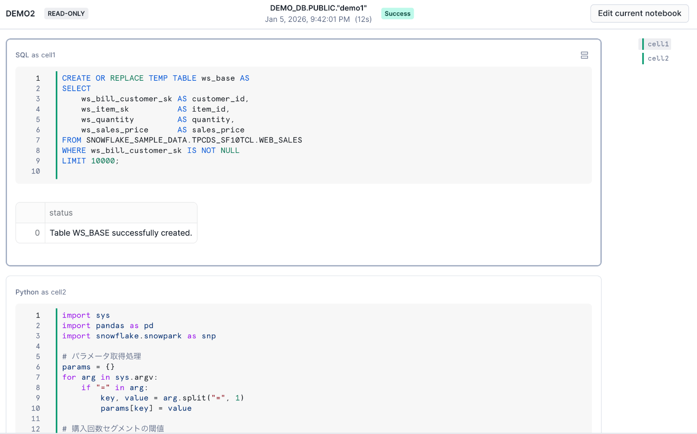 本デモでは、SNOWFLAKE_SAMPLE_DATA.TPCDS_SF10TCL.WEB_SALES を題材に、顧客ごとの購買状況を集計する処理をNotebook上で作成し、そのNotebookをスケジューリング実行する流れを確認します。