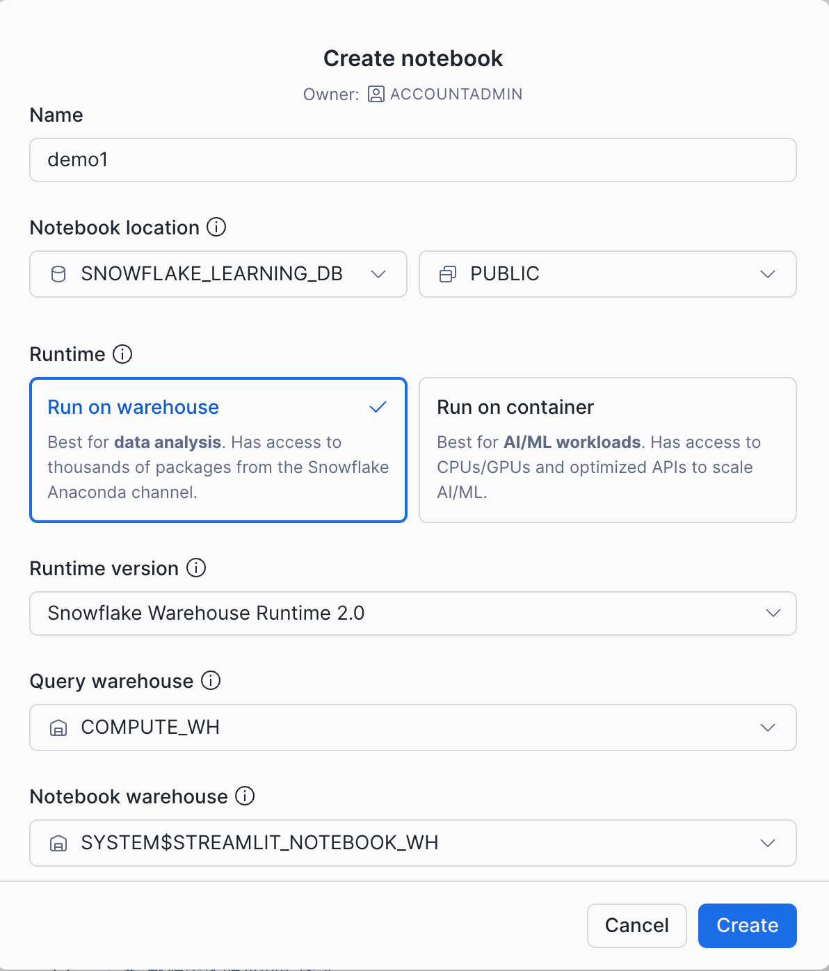 Snowflake Notebooksでは、用途に応じてウェアハウスランタイムとコンテナランタイムの2種類の実行環境を選択できます。