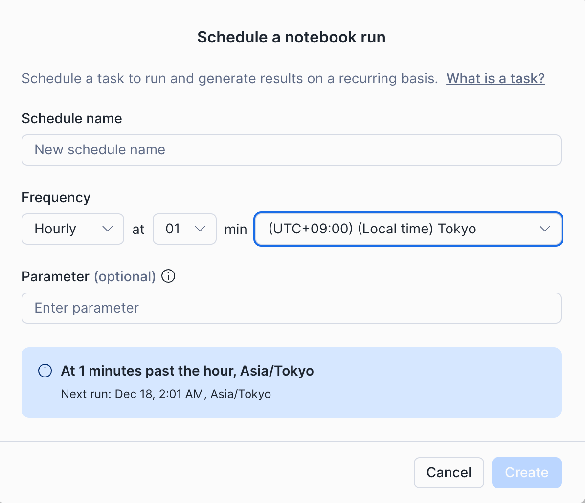 一方で、Notebookのスケジューリングは、こうしたTaskの仕組みを細かく把握していなくても、Notebook上の一連の処理をまとめて定期実行できる点が特徴です。
