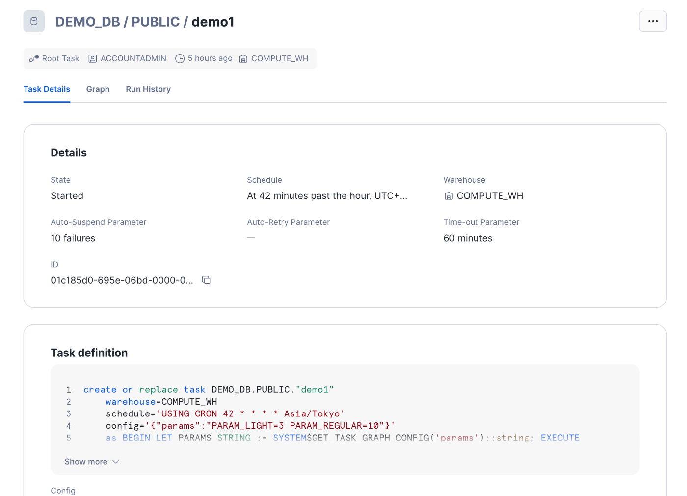 この画面では、スケジュールの状態(Started/Suspended)、実行頻度、使用しているウェアハウスなどを確認できます。さらに下にスクロールすると、Task definitionが表示されます。ここを見ると分かる通り、Notebookのスケジューリングを作成すると、内部的にはSnowflake Taskが自動生成されていることがわかります。