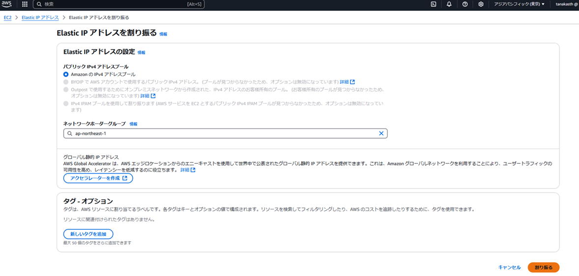 - Elastic IPアドレス(AWSの外部からインターネットアクセスするためのパブリックIPアドレス)を作成する