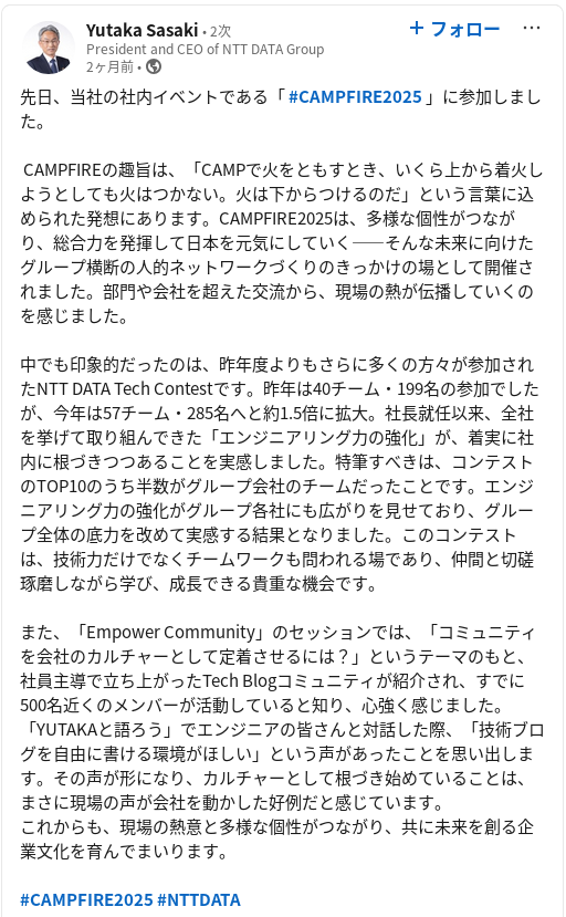 NTT DATA公式アカウントです。 技術を愛するNTT DATAの技術者が、気軽に楽しく発信していきます。 当社のサービスなどについてのお問い合わせは、 お問い合わせフォーム nttdata.com/jp/ja/contact-us/ へお願いします。