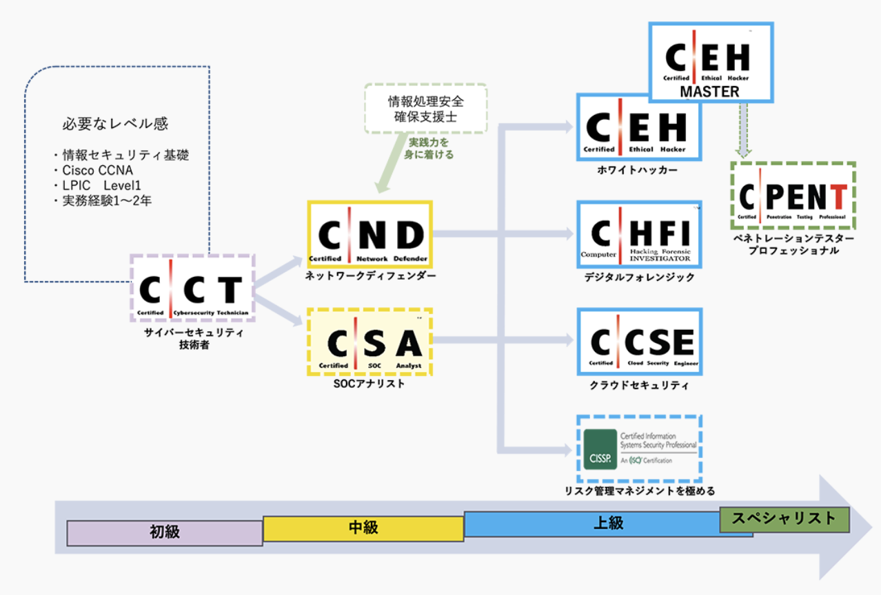 EC-CouncilによるとCCTは基礎を学ぶ初級レベル、CSAはSOC運用に踏み込む中級レベルに位置づけられます。