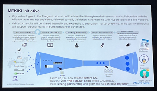 続いて、NTT DATA Group本社のTakashiより、MEKIKI Initiativeの取り組みと、Generative AIに関するPoCの紹介が行われました。MEKIKI Initiativeは、急速に進化するAI関連技術の中から、実際のビジネスや業務で活用可能な技術を見極め、検証・評価していくことを目的とした活動です。