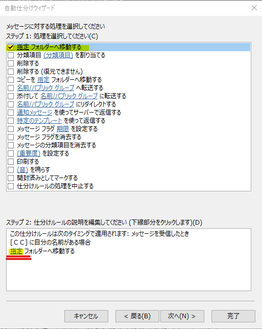 「指定フォルダーへ移動する」を選択したら、下にある「指定」をクリックします。